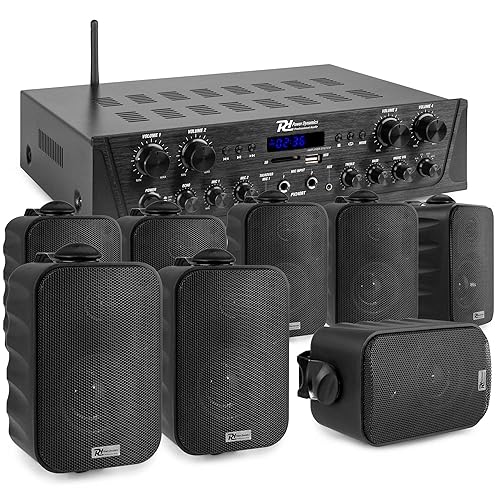 Power Dynamics Pack Sonorisation 4 Zones 400 Watts Bluetooth avec 8 Enceintes Noires, Lecteur MP3 USB/SD, Radio FM, Entrées Micro, Télécommande - Kit Complet pour Multi‑Pièces, Restauration